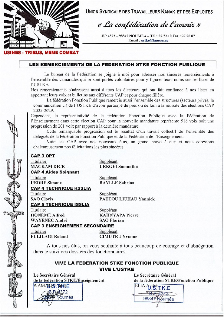 Les remerciements de la Fédération STKE Fonction Publique après les résultats des élections CAP 2025-2029