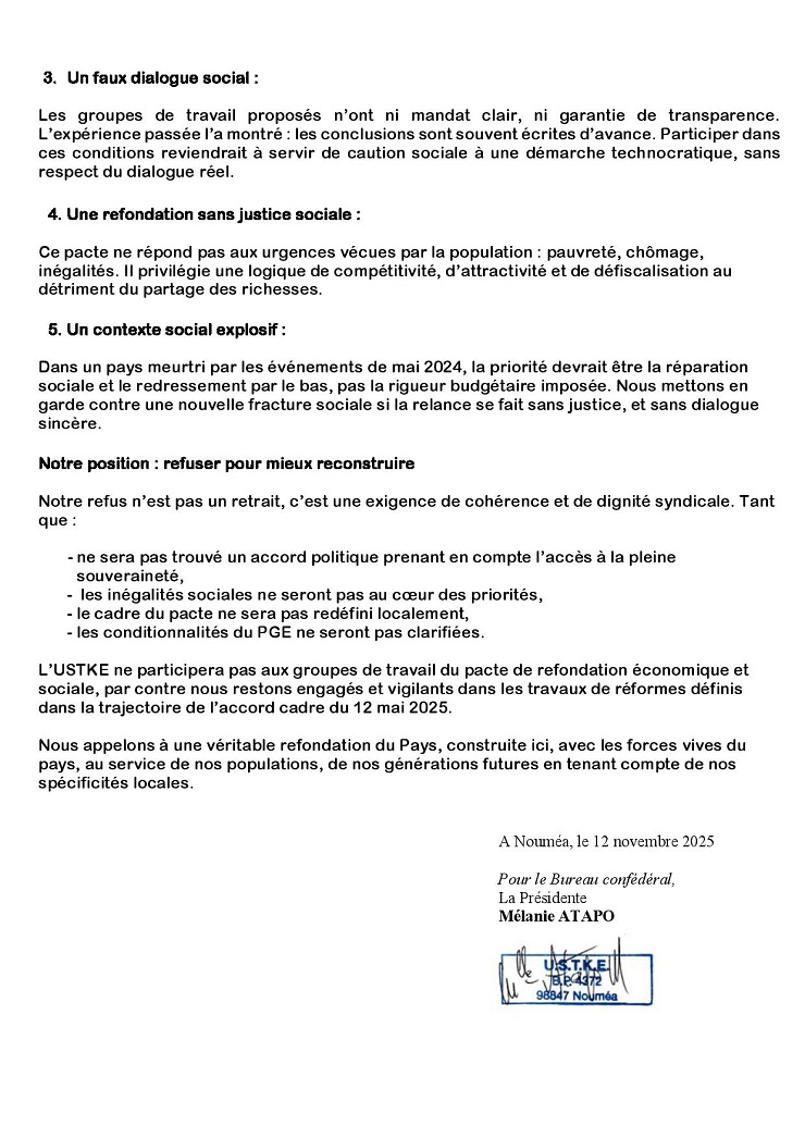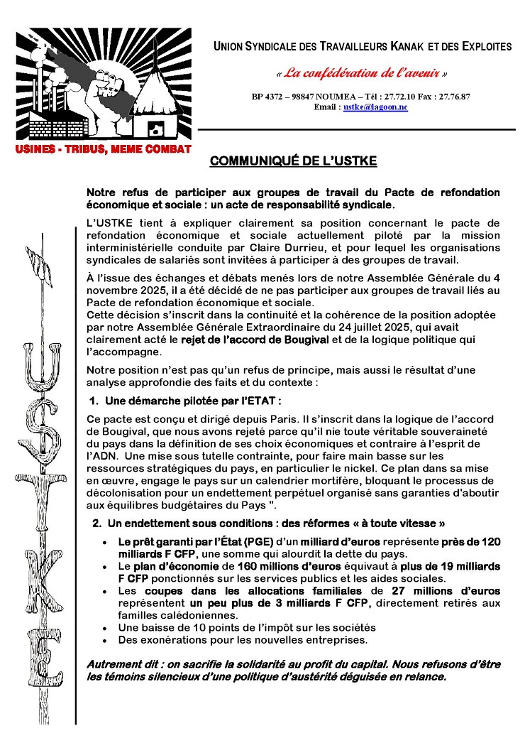 Refus de l'USTKE de participer aux groupes de travail du Pacte de refondation économique et sociale
